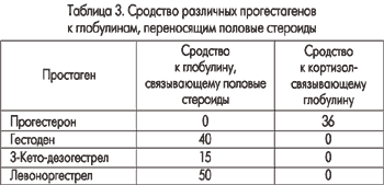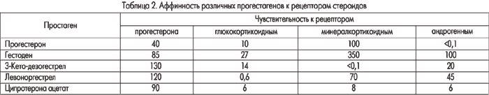 Из современных прогестагенов особый интерес представляет дезогестрел (активный метаболит 3-кето-дезогестрел). В многочисленных исследованиях (Kloosterboer H. et al., 1988; Pollow K., Jichem M., 1989; Phillips A. et al., 1990; Fuchrman U. et al., 1995; Kuhl H., 1996) подтверждена самая высокая селективность его действия — при высокой антигонадотропной и прогестагенной активности дезогестрел имеет самую низкую андрогенную активность (табл. 2).