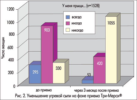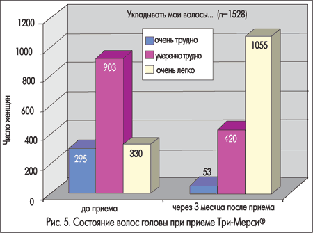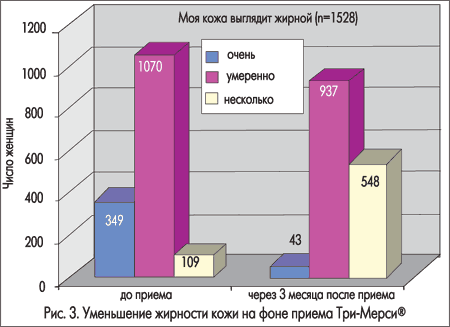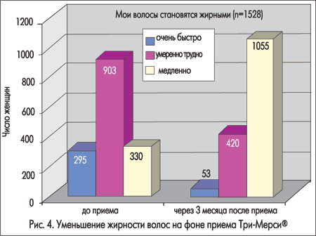 На фоне приема Три-Мерси® отмечалось уменьшение жирности волос. Если в начале исследования на то, что их волосы очень быстро становятся жирными, жаловались 295 (19,3%) женщин, то через три месяца приема Три-Мерси® — лишь 53 (3,5%) женщины (рис. 4).