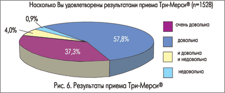 Свою удовлетворенность приемом Три-Мерси® отметили 1453 (95,1%) женщин (рис. 6). Более того, 1430 (93,6%) женщин выразили желание рекомендовать использовать Три-Мерси® своим знакомым.