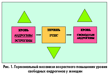 Особую группу гиперандрогенных состояний, которые можно назвать естественной, или возрастной, гиперандрогенией, составляют постменопаузальные осложнения: огрубение голоса, себорея, изменения липидного обмена, андроидное ожирение, инсулинорезистентность, появление волос на щеках, подбородке и т.д. Известно, что эстрогены стимулируют синтез ГСПС в печени. В условиях возрастного эстрогенного дефицита и относительного преобладания андрогенов в крови повышается уровень свободных андрогенов (рис. 1). В связи с этим гормональная диагностика должна базироваться, прежде всего, на определении уровня эстрогенов и биологически активной фракции андрогенов, а не только их общего содержания, которое может оставаться нормальным. Например, у 20-30% пациенток с гирсутизмом в крови определяется нормальный уровень общего тестостерона.