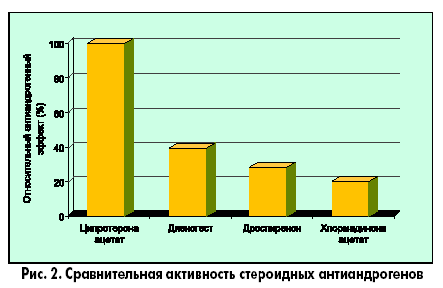 Вещества с антиандрогенными свойствами выявлены среди синтетических прогестинов, к которым относятся некоторые химические дериваты прогестерона (ципротерона ацетат – ЦПА, хлормадинона ацетат), 19-нортестостерона (диеногест) и спиронолактона (дроспиренон). Самым активным антиандрогеном оказался ЦПА (рис. 2), на основе которого созданы препарат Андрокур, комбинированный оральный контрацептив Диане-35 и препарат для менопаузальной гормонотерапии Климен.