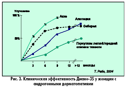Диане-35 признан как препарат выбора для лечения гирсутизма и других кожных проявлений гиперандрогении у женщин репродуктивного возраста. Он замедляет рост волос на лице и других участках тела, препятствует облысению, снижает гиперпродукцию кожного жира, улучшает его эвакуацию из сальных желез благодаря уменьшению ороговения их протоков. Антиандрогенный эффект ЦПА усиливается наличием в составе данного контрацептива этинилэстрадиола, который повышает уровень ГСПС и снижает содержание биологически активного тестостерона в крови. Лечение проводится длительно: при гирсутизме – не менее 9-12 месяцев, при акне и себорее не менее 6-9 месяцев (рис. 3).