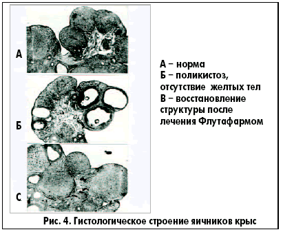 В ходе экспериментов у самок крыс воспроизводили модель поликистоза яичников подсадкой под кожу силастиковых капсул с тестостероном. У большинства из них в крови повышался уровень тестостерона, прекращались эстральные циклы и наступало состояние ановуляторного бесплодия с типичными морфологическими изменениями яичников. Однако пероральное введение флутамида на протяжении 3-5 условных эстральных циклов перед спариванием с самцами восстанавливало половую цикличность и фертильный потенциал подопытных самок, которые приносили нормальное потомство. При этом восстанавливалась структура яичников, в них появлялись желтые тела, что однозначно указывало на возобновление овуляций (рис. 4). Применение антиандрогена до спаривания не вызывало эмбриотоксического или тератогенного эффектов.