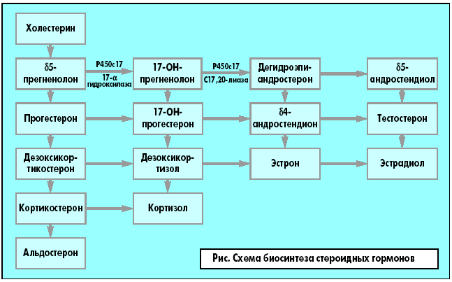 В 1990 году было установлено, что гиперпродукция Д5- и Д4-стероидов как сетчатой зоной коры надпочечников, так и текальными клетками яичников может быть связана не только с дефицитом определенных ферментов, но и с их повышенной активностью. Так, усиление эффекта сразу двух энзимов – 17 гидроксилазы и С17, С20-лиазы – обусловлено дисрегуляцией цитохрома Р450с17, который регулируется единым универсальным геномом СУР17, локализующимся на 10-й хромосоме. Ген СУР17 имеет экспрессию как в коре надпочечников, так и в гонадах, поэтому его продукт – микросомальный фермент Р450с17 – имеет значение в продукции глюкокортикоидов и половых гормонов, что представлено на рисунке.