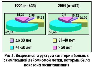 Ранее считалось, что лейомиома матки – заболевание женщин перименопаузального возраста. Однако в последние годы эта патология все чаще выявляется у молодых нерожавших девушек. Так, при сравнении возрастной структуры данной категории пациенток, находившихся на лечении в наших клиниках, в последнее десятилетие отмечено увеличение удельного веса пациенток активного репродуктивного возраста (рис. 1).