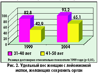 В настоящее время изменение стиля жизни современной женщины привело к тому, что зачастую выполнение ею репродуктивной функции в силу различных причин (занятость, профессиональный рост, отсутствие надежного спутника жизни и т. д.) откладывается до более старшего возраста. К тому же внедрение новых репродуктивных технологий, расширяющих возрастные границы фертильного периода, дает возможность вынашивания детей даже в пременопаузальном возрасте. В связи с этим среди женщин с миомой увеличилось число желающих сохранить матку, особенно среди пациенток старших возрастных групп (рис. 2).