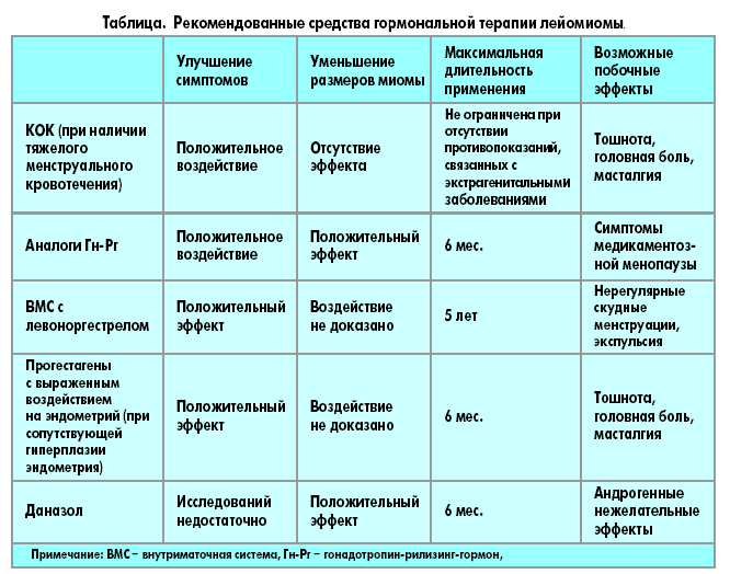 Основой консервативного лечения лейомиомы является гормональная терапия, применение которой основано на концепции гормонозависимости опухоли [3]. Главным принципом гормонотерапии является создание абсолютной или относительной гипоэстрогении (табл.).