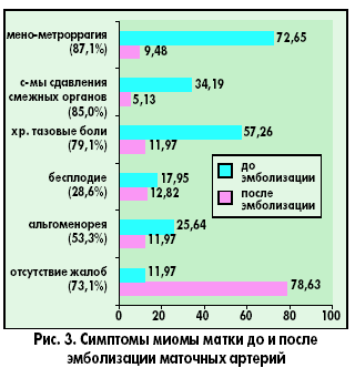 В результате проведенных в нашей клинике наблюдений за женщинами с лейомиомой матки после ЭМА было отмечено уменьшение частоты мено- и метроррагий на 87,1%, симптомов сдавливания смежных органов (частота мочеиспускания, дизурические явления, запоры и т. д.) – на 85,0% (рис. 3). Частота клинической эффективности в уменьшении хронических тазовых болей составила 79,1, альгоменореи – 53,3%. Средний объем матки через 6 мес. после ЭМА уменьшился на 40,1%, через 12 мес. – на 66,3%, объем доминантного фиброматозного узла – на 54,1 и 71,2% соответственно.