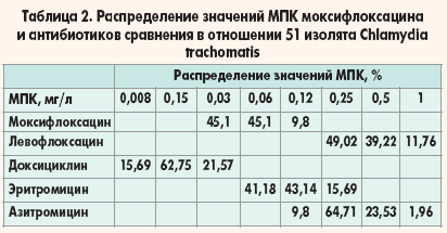 В целом моксифлоксацин проявил высокую активность в отношении изолятов C. trachomatis, которая превышала таковую левофлоксацина, эритромицина и азитромицина. Наименьшие значения МПК показал доксициклин, тем не менее МПК90 лишь на одно разведение было больше, чем у моксифлоксацина.