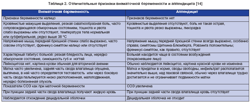 Внематочную беременность следует дифференцировать с прерывающейся маточной беременностью (начавшийся или неполный аборт), перекрутом кисты и апоплексией яичника, острыми воспалительными процессами придатков матки и разрывом пиосальпинкса или вскрывшимся тубоовариальным абсцессом, некрозом субсерозного миоматозного узла, острым аппендицитом, почечной коликой, кишечной непроходимостью. Разработаны удобные, достаточно подробные и информативные таблицы для дифференциальной диагностики многих из указанных заболеваний (табл. 1, 2, 3).