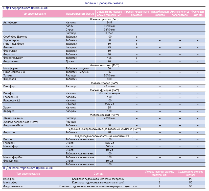 Так что же изменилось в вопросе об анемии беременных? Самое главное – отношение к ней, как к патологии, подлежащей предупреждению и, тем более, лечению во всех случаях. Это необходимо знать сегодня каждому врачу женской консультации и акушерского стационара. Но когда все-таки нужно лечить, то делать это следует правильно, выбирая оптимальные средства. Чтобы помочь врачу самому сделать такой выбор, мы привели таблицу железосодержащих препаратов.