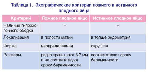 У 7 женщин по данным УЗИ визуализировалось в полости матки ложное плодное яйцо, что требовало его дифференциальной диагностики с истинным. При этом оценивали его контур, локализацию, форму и размеры (табл. 1).