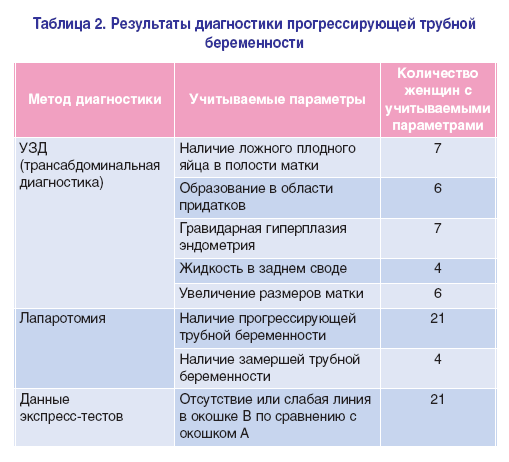 Тест на беременность оценивали на 25 образцах мочи пациенток с прогрессирующей внематочной беременностью и сравнивали с результатами УЗД и лапаротомического оперативного вмешательства (табл. 2).
