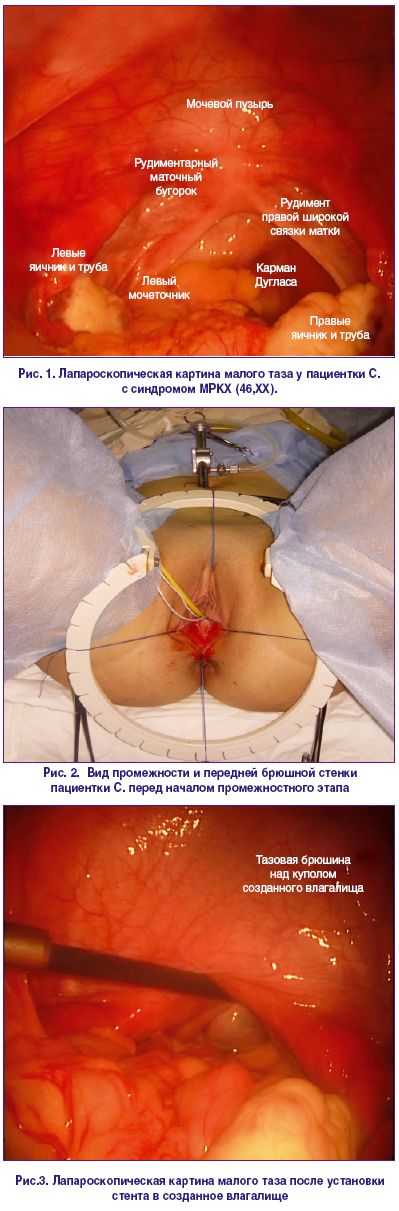 Во всех случаях промежностный этап операции начинался с крестообразного рассечения тканей преддверия влагалища. При помощи ножниц и пальцев хирурга формировался вагинальный туннель между стенками мочевого пузыря и прямой кишки. При помощи электрокаутеризации выполнялся тщательный гемостаз. Ассистент обеспечивал эндоскопическую диафаноскопию, благодаря чему свет лапароскопа создавал оптимальные анатомические ориентиры, что позволяло избежать вскрытия брюшины малого таза. Рассеченную вестибулярную слизистую ушивали в четырех точках рассасывающим материалом (викрилом 4.0). Во вновь созданный туннель вводился жесткий полый стент длиной 10 см и диаметром 2,5-3 см, предварительно покрытый одним слоем Surgicel размером 12х7 см. В целях обеспечения дренирования неовагины, полый стент имел одно перфоративное отверстие в области его тазового конца. Углы слизистой преддверия влагалища максимально глубоко фиксировались во вновь созданном влагалище, что обеспечивало последующую быструю эпителизацию. По завершении вмешательства стент фиксировали нерассасывающимися лигатурами к основанию малых половых губ. В мочевом пузыре оставляли катетер на весь период госпитализации (2 сут).