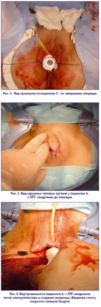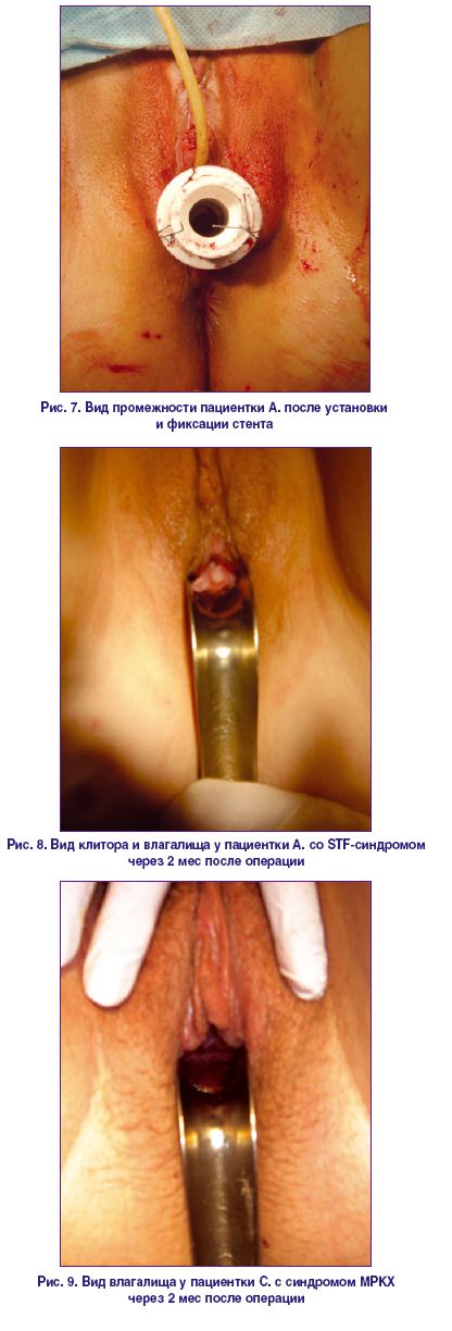 Продолжительность оперативного вмешательства варьировала от 20 до 35 мин (исключение составлял случай у пациентки А. с STF – у нее проводили этап клиторопластики по поводу мегаклитора – суммарная продолжительность операции составила 56 мин). Кровопотеря при операции была минимальной – от 30 до 60 мл. Во всех случаях глубина созданного влагалища составляла 8-10 см. Интраоперационных и послеоперационных осложнений зарегистрировано не было (рис. 1-3, 4-6, 7-9).