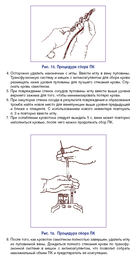 При первом методе ПК собирают после рождения ребенка и пересечения пуповины, когда плацента находится еще в утробе (in utero). При втором – после рождения ребенка и отделения и рождения плаценты (ex utero). Сбор ПК с применением метода еx utero должен выполняться в максимально кратчайшие сроки после рождения плаценты с участием квалифицированного персонала в отдельном боксовом помещении. Собирается ПК в стандартный мешок для сбора донорской крови с антикоагулянтом цитрат-фосфат-декстрозой, насыщенной или обедненной аденином. Плацента в данном случае укладывается на специально предназначенную для сбора ПК рамку, и кровь собирается самотеком из самых трудных и отдаленных мест при помощи венепункции. Пуповину тщательно обрабатывают антисептическим раствором, после чего в вену вводят иглу трансфузионной системы.