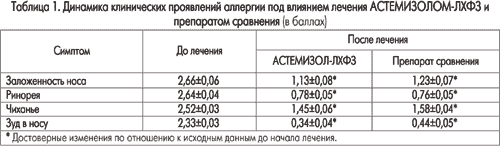 Под влиянием препаратов уменьшалась выраженность клинических проявлений аллергии: кожного зуда, гиперемии, крапивницы и т. д. Терапевтический эффект отмечался уже к концу первых суток. Обратное развитие симптомов аллергии происходило в такой последовательности: к концу первых суток существенно уменьшалась выраженность кожного зуда, на 2-е сутки зуд исчез практически у всех больных, гиперемия — на 3-и сутки, элементы кожной сыпи — на 3-5-е сутки. Полный клинический эффект зарегистрирован к концу 6-х суток лечения. В таблице 1 представлена динамика клинических проявлений аллергии под влиянием лечения АСТЕМИЗОЛОМ-ЛХФЗ и препаратом сравнения.