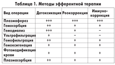 Под эфферентной терапией понимают лечебные методы, способствующие обработке крови и других жидких сред организма экстра- или интракорпорально с целью детоксикации, улучшения реологических свойств, иммунокоррекции. Эффективность эфферентных методов терапии складывается из специфических, неспецифических и дополнительных воздействий. Среди специфических выделяют такие воздействия, как детоксикация, реологическая коррекция и иммунокоррекция, повышение чувствительности к эндогенным и медикаментозным веществам. Неспецифические воздействия определяются, прежде всего, контактом крови с поверхностями магистралей и мешков и проявляются гемодинамическими реакциями, перераспределением клеток крови, активацией эндокринной системы. Разные методы эфферентной терапии обладают различной степенью выраженности специфических эффектов (табл.1).