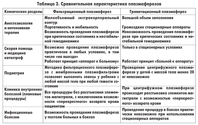 Существует два основных метода плазмафереза — гравитационный и фильтрационный. Первый осуществляется с помощью постоянно-проточного или фракционного центрифугирования в специальных аппаратах (ПФ-0,5; ФК-3,5, в аппаратах зарубежных производителей — Gambro, Fresenius, Terumo) или в пакетах центрифуг типа РС-6, ОС-6, ЦЛ-3,5. Второй метод — фильтрация крови в специальных плазмофильтрах различных фирм производителей. Сравнительная характеристика методов плазмафереза позволяет оценить преимущества и недостатки каждого из них (табл. 2).