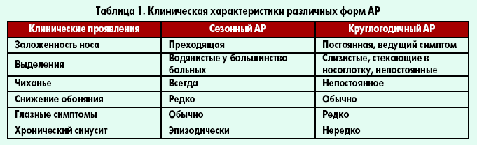 Клинические проявления АР характеризуются четырьмя классическими симптомами: щекотанием в носу, приступообразным чиханьем, водянистыми выделениями из носа (ринореей) и заложенностью носа. Нередко к основным симптомам присоединяются головная боль, снижение обоняния, проявления конъюнктивита. Возможны и такие жалобы пациента, как чувство распирания и боли в придаточных пазухах носа, ухе, снижение слуха, изменение голоса, носовые кровотечения, явления дерматита вокруг носа, частые фаринголарингиты, снижение внимания и работоспособности.
