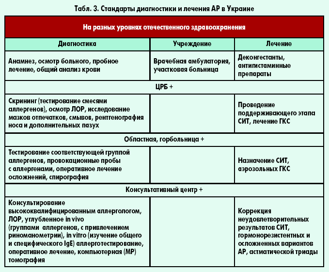 Последовательность диагностической процедуры при КАР приведена выше. Дифференцировать КАР следует с идиопатическим (ИР), инфекционным (ИНР), гипертрофическим ринитом (ГР), полипозом носа (ПН), неаллергическим ринитом с эозинофилией (nares) (NS), что весьма непросто (табл. 2).