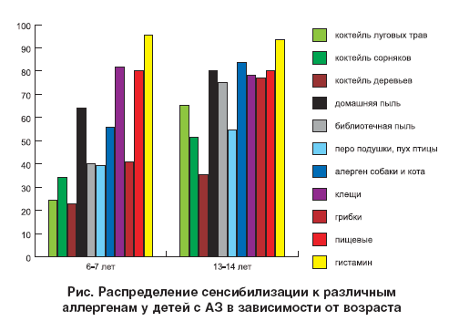 Распределение сенсибилизации к различным группам аллергенов у детей с АЗ в зависимости от возраста показано на рисунке.