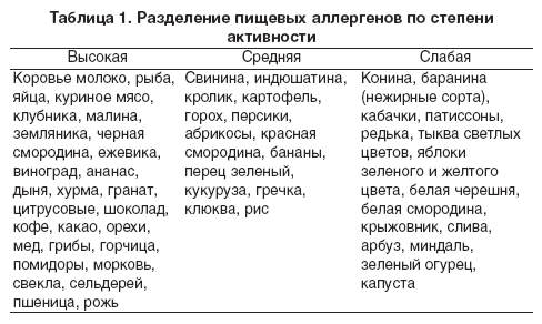 У детей ранннего возраста одним из ведущих этиологических факторов являются пищевые аллергены (коровье молоко, яйца, злаки, рыба, соя, овощи и фрукты оранжевого цвета). С возрастом спектр пищевых аллергенов изменяется как по качеству, так и по частоте выявления. В таблице пищевые продукты разделены по степени их аллергизирующей активности.