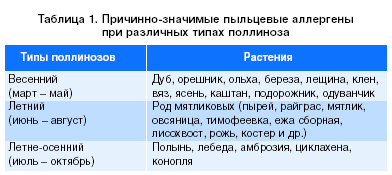 Клиническое течение поллиноза характеризуется сезонными обострениями, обусловленными контактом с пыльцой растений. В климато-географических зонах Украины различают три периода клинической манифестации аллергии к пыльце: весенний, летний и летне-осенний (табл. 1).