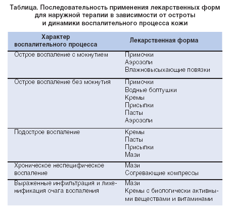 В зависимости от клинических проявлений заболевания применяются различные лекарственные формы препаратов наружного действия (таблица). При этом используются разнообразные средства: топические стероиды; препараты, содержащие антисептики, антибиотики; противогрибковые; кератолитические и кератопластические, антигистаминные, увлажняющие, стимулирующие эпителизацию вещества; фитопрепараты и некоторые противовоспалительные средства нового поколения (селективные ингибиторы цитокинов воспаления). Возможны различные комбинации перечисленных выше препаратов [4].