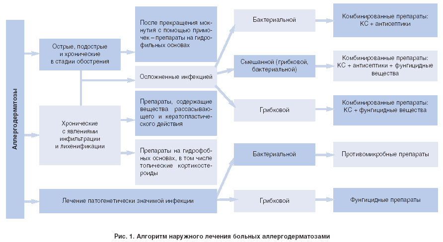 Если речь идет об аллергическом дерматите, то в ряде случаев достаточно выявить и устранить соответствующий аллерген, применить адекватную наружную терапию, что позволяет достичь клинической ремиссии. К сожалению, в реальной жизни эта схема не всегда осуществима даже при лечении больных аллергическим дерматитом, не говоря уже о таких хронических, часто генетически детерминированных заболеваниях, как атопический дерматит, экзема и др. Следует также учитывать, что эти заболевания, как правило, протекают на определенном патогенетическом фоне (патологии желудочно-кишечного тракта, нарушений со стороны нервной системы, эндокринопатий и др.). В связи с этим лечение аллергических дерматозов является обычно комплексным и включает в себя как системную, так и наружную терапию.