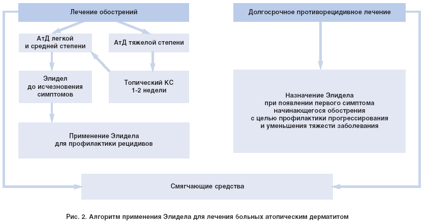 С целью обеспечить длительный контроль над течением заболевания, включающий снятие зуда, уменьшение клинических проявлений на коже, удлинение периода клинической ремиссии, уменьшение потребности в ТС, и таким образом свести к минимуму связанные с применением ТС побочные реакции разработан новый нестероидный препарат пимекролимус (Элидел), применение которого уже на 2-3-й день позволяет достичь желаемых результатов. Препарат особенно эффективен в проблемных зонах, к которым относят лицо, шею, крупные складки. Он разрешен к применению с трехмесячного возраста. Высокая безопасность данного средства дает возможность применять его продолжительное время, что позволяет осуществлять длительный контроль над течением заболевания [15-17]. Примером использования Элидела может служить алгоритм лечения больных атопическим дерматитом (рис. 2).