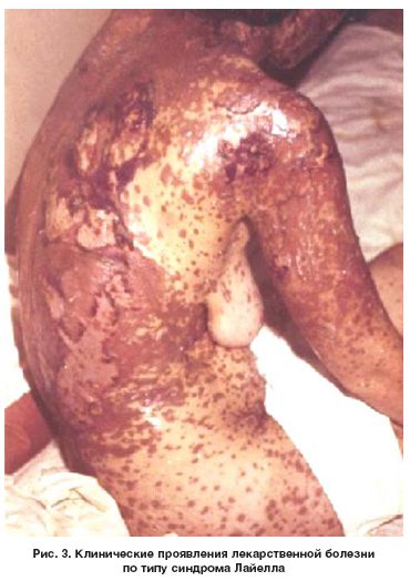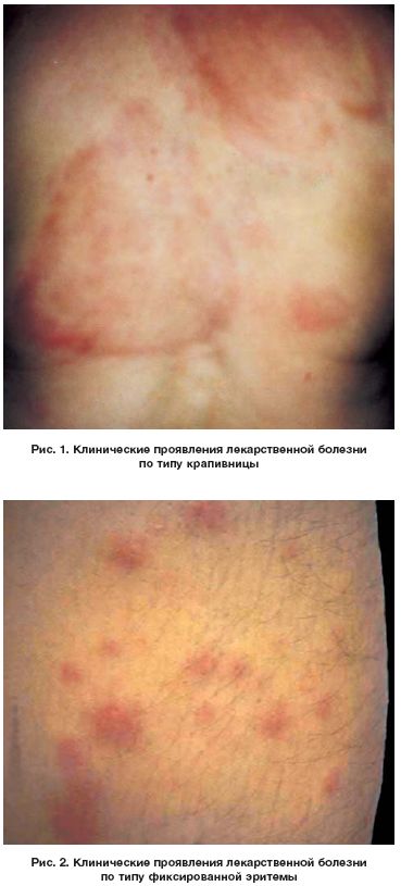 Несмотря на то что подтверждением диагноза служат циклическое течение процесса и довольно быстрая его ремиссия после отмены плохо переносимого ЛС, все же имеются трудности в дифференциальной диагностике ЛБ с основным заболеванием, за осложнение которого ее часто и принимают. Особенно сложно дифференцировать ЛБ от различных заболеваний кожи, поскольку ее кожные проявления имеют большое сходство с клиникой многих истинных дерматозов (рис. 1-2, 3).