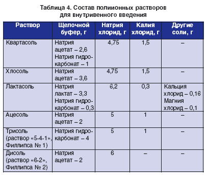 В настоящее время в отечественном здравоохранении для парентеральной регидратации и реминерализации используют растворы, состав которых приведен в таблице 4.
