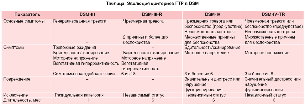 Началась «индустрия» коморбидности, понятие о которой примерно в это же время ввел в медицинскую литературу Feinstein (1970). Среди всех тревожных расстройств наибольшую «травму» понятие коморбидности нанесло ГТР, которое в соответствии с изменяющимися представлениями о коморбидности эволюционировало на протяжении более 20 лет. Первоначально отсутствие специфических особенностей и схожесть ГТР с нормальной тревогой приводило исследователей к мысли о недостаточной диагностической достоверности и валидности данного диагноза. Обозначенное в DSM-III (таблица) как остаточная категория (при выделении из невроза тревоги ПР) ГТР долгое время рассматривалось как «условный синдром». Диагноз ГТР не мог быть поставлен, если пациенты отвечали критериям других психических расстройств. Высокая коморбидность ГТР с большой депрессией, уже тогда отмечаемая многими авторами, предполагала, что это расстройство лучше осмысляется как продром, резидуальная категория или маркер тяжести, но не как независимое расстройство. Однако в некоторых исследованиях было показано, что коморбидность ГТР с другими расстройствами уменьшается со временем.