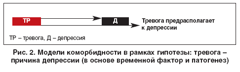 Вторая гипотеза коморбидности постулировала представление о том, что депрессия является следствием тревоги или тревога является причиной депрессии (рис. 2).