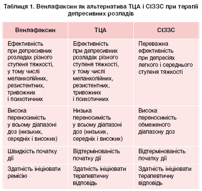 Таблиця 1. Венлафаксин як альтернатива ТЦА і СІЗЗС при терапії депресивних розладів