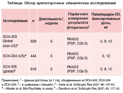 Палиперидон ER проверен в клинических испытаниях с участием более 1 600 пациентов в 23 странах. Доктор А. Шрайнер представил данные краткосрочных исследований по палиперидону ER, которые подтверждают его эффективность в сравнении с плацебо не только по шкале оценки позитивных и негативных синдромов (PANSS), но и по шкале личной и социальной активности (PSP) (таблица).