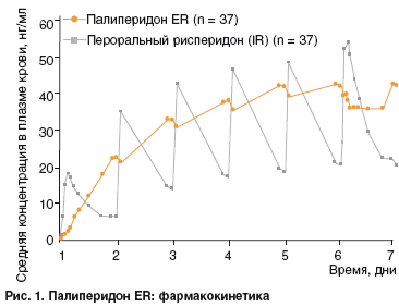 А. Шрайнер представил сравнительные данные по профилю концентрации при использовании перорального рисперидона и палиперидона ER, демонст-рирующие преимущества последнего (рис. 1).