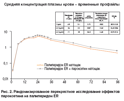 С.А. Маляров продемонстрировал результаты рандомизированного перекрестного исследования, которые подтверждают отсутствие клинически значимых изменений плазменной концентрации палиперидона ER после одновременного приема с селективным ингибитором обратного захвата серотонина пароксетином (рис. 2).
