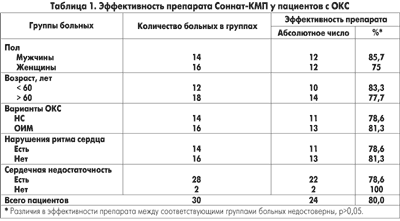 Применение препарата Соннат-КМП оказалось эффективным у 24 (80%) из наблюдавшихся пациентов. Характеристика эффективности в различных группах обследованных больных представлена в таблице 1. Как видно из представленной таблицы, эффективность препарата Соннат-КМП не зависела от пола и возраста пациентов. Препарат был в равной степени эффективен у пациентов с нестабильной стенокардией (78,6%) и с ОИМ (81,3%), при отсутствии (81,3%) и наличии нарушений ритма сердца (78,6%), у лиц без проявления сердечной недостаточности (100%) и при наличии таковых (78%), во всех случаях р>0,05.