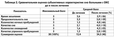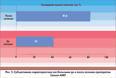 Результаты оценки субъективных характеристик сна до и после лечения препаратом Соннат-КМП представлены в таблице 2 и на рисунках 1, 2. Соннат-КМП улучшал качественные и количественные характеристики сна у больных с ОКС на 40,3%.