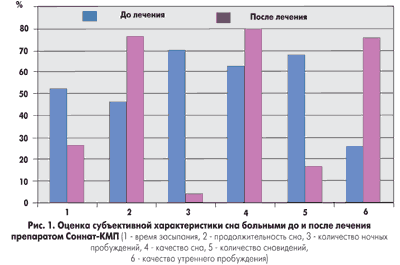 Сомнологическое обследование больных производилось с помощью анкетирования, за основу была принята пятибалльная оценка субъективных характеристик сна до и после лечения препаратом Соннат-КМП. Изучали следующие показатели: время засыпания, продолжительность сна, количество ночных пробуждений, качество сна, количество сновидений, качество утреннего пробуждения. Максимальному числу баллов соответствовал лучший результат. Данная анкета включала также и скрининг синдрома апноэ во сне [10]. По итогам анкетирования подсчитывалась суммарная оценка. Лечение препаратом Соннат-КМП считалось эффективным при увеличении количества баллов анкеты субъективной характеристики сна в процессе лечения не менее чем на 10 из 30 возможных. Статистическая обработка материала проводилась с помощью программы Microsoft Exel.