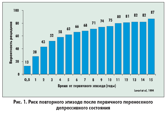 Lavori и соавт. (1994) [3] в рамках ретроспективного и проспективного натуралистического исследования при формулировании задач и оценке различных подходов к терапии депрессии показали, что снижение риска повторного эпизода болезни определяется в большей степени продолжительностью стабилизирующей терапии после купирования симптомов депрессии и формирования ремиссии, чем собственно эффективностью активной терапии острого депрессивного состояния. По их данным, риск повторного эпизода у первичных депрессивных больных, лечение которых ограничилось лишь этапом активной терапии, за последующие 15 лет составляет более 80% (рис. 1).