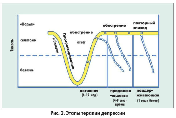 Подобные работы и накопившийся за десятилетия опыт психофармакотерапии вновь возвращают нас к представлениям Крепелина о депрессии как продолжительном, рекуррентном и зачастую хроническом заболевании. В связи с этим терапия этого расстройства может быть подразделена на краткосрочную и долгосрочную с самостоятельными целями, способами их осуществления и методами оценки достигнутых результатов [4].