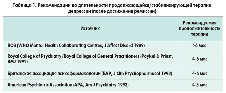 Активная терапия направлена на купирование аффективной симптоматики и формирование состояния ремиссии. По достижении состояния ремиссии должен обязательно следовать период продолжающейся терапии, которая стабилизирует (укрепляет и консолидирует) достигнутую ремиссию, предотвращает обострение (рецидив) симптоматики в рамках текущего эпизода и обеспечивает процесс социальной реадаптации (табл. 1). В течение этого периода обычно поддерживается та же дозировка препарата, которая использовалась в период активной терапии. Возобновление депрессивной симптоматики на этапах активной и стабилизирующей терапии принято считать обострением текущего эпизода и результатом неадекватной его терапии (недостаточной по продолжительности и/или уровню дозировки). Исследователи пришли к консенсусу, что повторным эпизодом можно считать появление депрессивных симптомов только после 6 месяцев ремиссии после предыдущей депрессии [6]. Условно считается, что эмоциональное состояние больного, перенесшего развернутый депрессивный эпизод, возвращается на доболезненный уровень после 4-6 месяцев ремиссии без клинически значимых аффективных симптомов. Только по истечении этого периода появление симптомов депрессии можно считать повторным эпизодом в рамках рекуррентного заболевания.