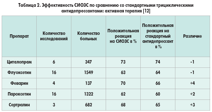 Из вышеприведенной таблицы 3 видно, что ни один серотонинергический антидепрессант не превосходит другой по эффективности, а частота обострений или повторных эпизодов в сравнении с плацебо в среднем ниже на 15-25%.
