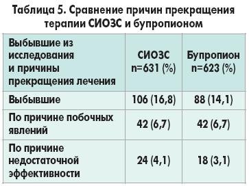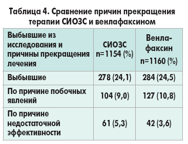 За последние годы терапевтический арсенал психиатров пополнился несколькими новыми антидепрессантами с более широким нейрохимическим спектром действия, но лишенных отрицательных свойств классических трициклических препаратов. Высказываются предположения, что эти препараты могут обладать большей эффективностью по сравнению с СИОЗС, а спектр побочных свойств, отличный от такового у СИОЗС, может быть более приемлемым для некоторой категории больных, в особенности при проведении продолжительной терапии. В недавно опубликованном метааналитическом обзоре сравнивались результаты клинических испытаний антидепрессантов СИОЗС как класса с наиболее распространенными новыми антидепрессантами различного спектра действия – венлафаксином, миртазапином и бупропионом [28]. В основу работы был положен анализ причин прекращения терапии новыми антидепрессантами. Если высказанные выше предположения являются справедливыми, то в рамках строгих клинических исследований в группе больных, принимавших СИОЗС, частота прерывания терапии должна быть выше по причине как недостаточной эффективности, так и непереносимости побочных явлений.