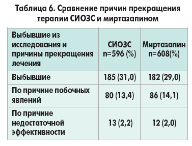 Приведенные в таблицах 4, 5, 6 материалы свидетельствуют о том, что частота досрочного прекращения терапии по причине неэффективности или непереносимости побочных явлений статистически значимо не отличалась между сравниваемыми препаратами. С учетом искусственности подбора пациентов для клинических испытаний эти данные не могут в полной мере отражать реалии повседневной клинической практики. Однако накопленная база данных по переносимости и безопасности СИОЗС, в том числе и при продолжительном лечении в условиях реальной клинической практики, является ведущим основанием для врача-клинициста при планировании антидепрессивной терапии.