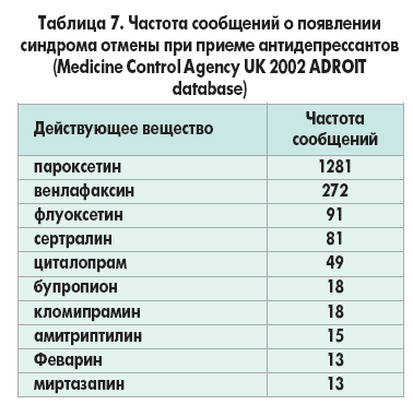 По материалам Британского агентства по контролю за лекарственными средствами, наибольшая частота сообщений о появлении признаков отмены зафиксирована при приеме пароксетина и венлафаксина, наименьшая – при приеме Феварина и миртазапина (табл. 7). Частота возникновения синдрома отмены при приеме пароксетина 100-кратно превосходит частоту появления при приеме Феварина [30]. Научный отдел того же агентства по лекарственной безопасности проводил сравнение флувоксамина (Феварина), пароксетина, флуоксетина и сертралина в когортном исследовании. Частота возникновения симптомов отмены при приеме пароксетина была существенно выше в сравнении с другими СИОЗС [31].