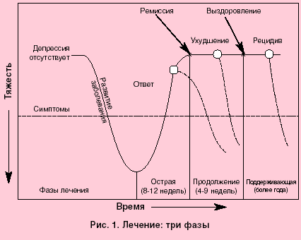 Рассмотрение фаз депрессивного расстройства сквозь призму лечения и рецидивирующего течения позволяет у многих пациентов снизить длительность активной фазы терапии (Kupfer, 1991).